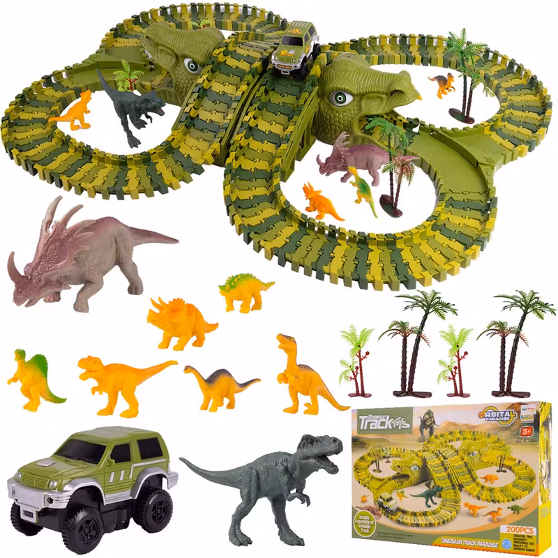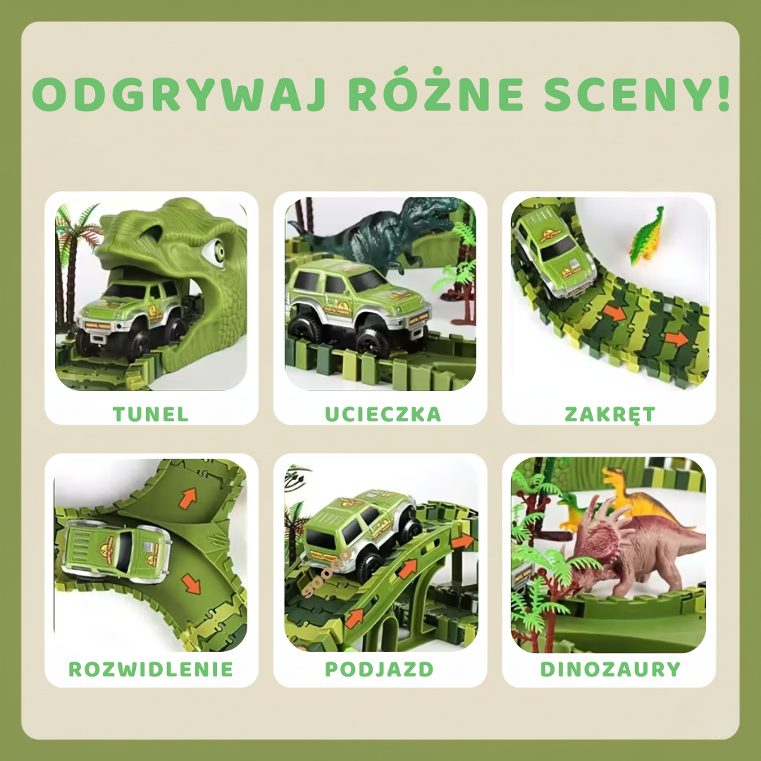 Elastyczne segmenty toru pozwalają na łatwe łączenie i modyfikowanie trasy, a realistyczne figurki dinozaurów i elementy krajobrazu sprawiają, że każda zabawa zamienia się w nową przygodę. 🚗🦖